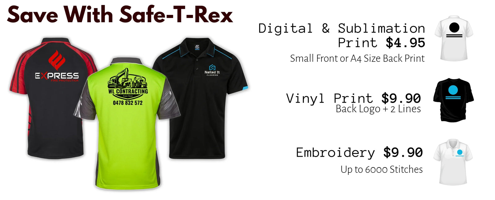 Shop our wide selection of custom printed work shirts and experience the difference of personalised work clothing online tailored to your brand’s needs. Choose Safe-T-Rex Workwear—where your workwear becomes your brand’s statement.